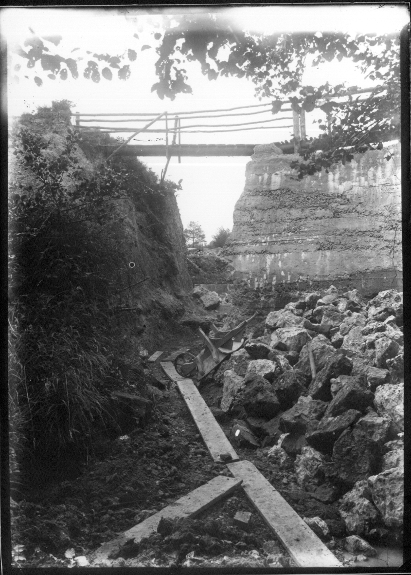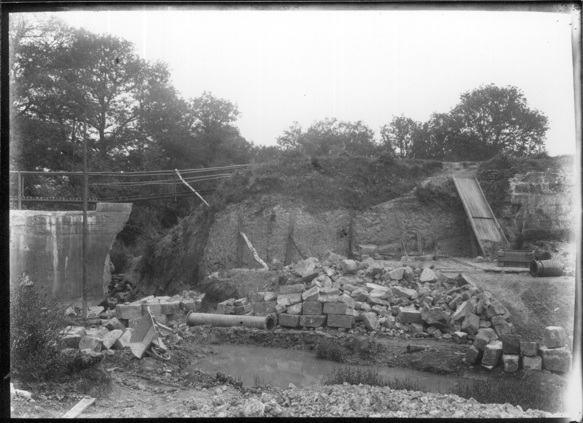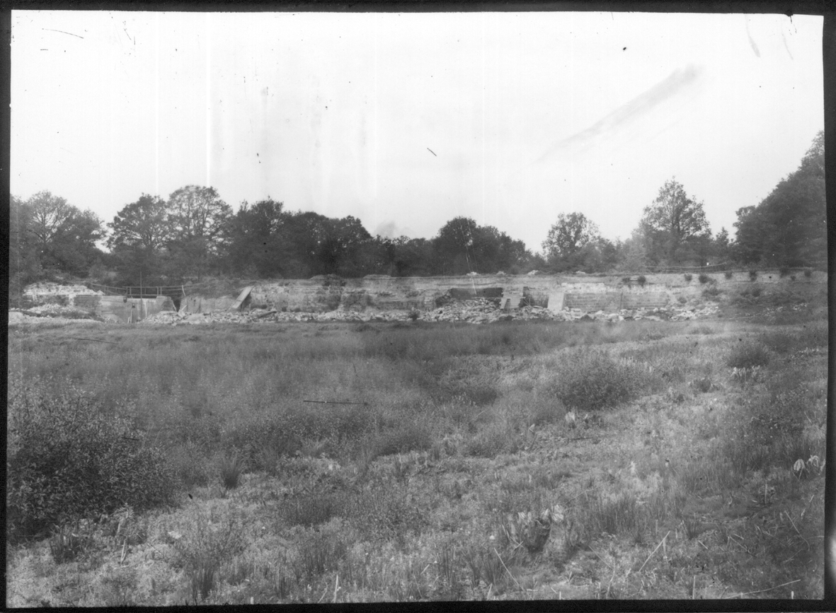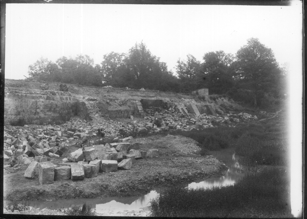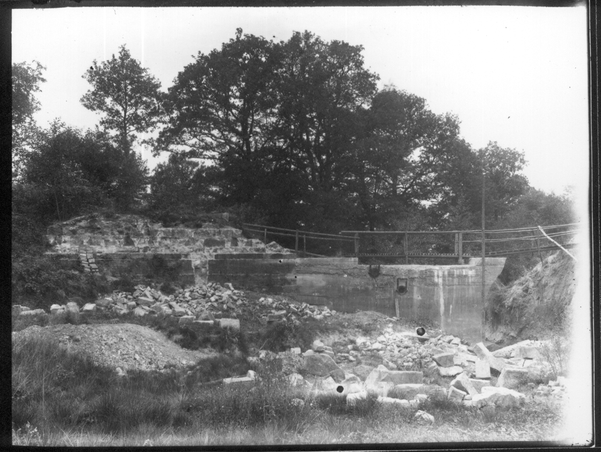 The pond bay of the Warren Furnace collapsed in about 1865 and was repaired unsatisfactorily. The new owner of the site in 1919, Lionel Robinson, restored the bay, allowing the pond to refill. Some of the earlier stone facing and buttresses can be seen in these prints from glass negatives.